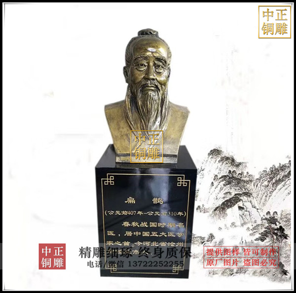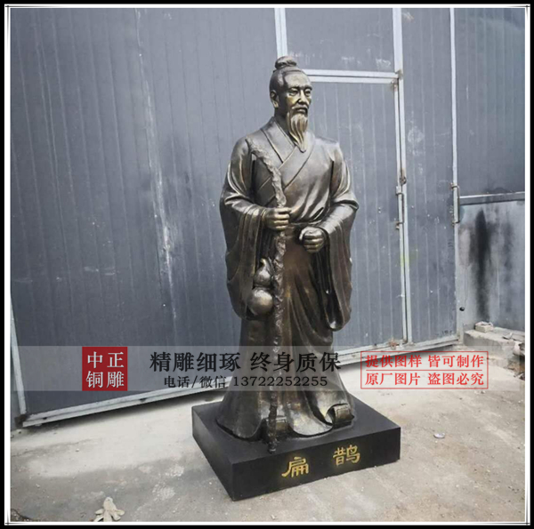 提起扁鵲,可是無(wú)人不知,無(wú)人不曉的神醫(yī)。由于他的醫(yī)術(shù)高超,被認(rèn)為是神醫(yī),所以當(dāng)時(shí)的人們借用了上古神話的黃帝時(shí)神醫(yī)“扁鵲”的名號(hào)來(lái)稱呼他。扁鵲是中國(guó)古代五大醫(yī)學(xué)家之首,著有《扁鵲內(nèi)經(jīng)》和《扁鵲外經(jīng)》?,F(xiàn)在的四診法也是扁鵲創(chuàng)造出來(lái)的。下面跟著古代人物雕塑廠家一起詳細(xì)的了解一下這位名醫(yī)吧!