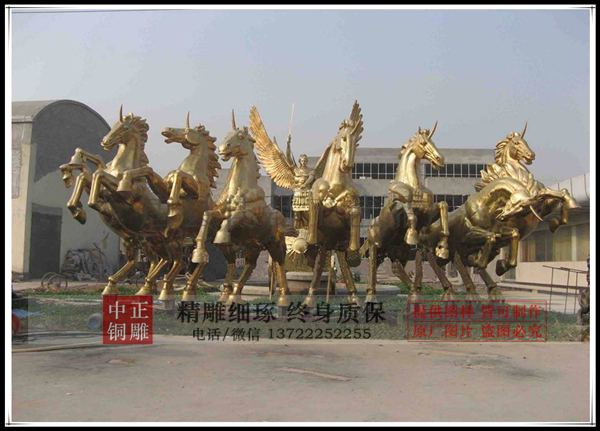 歐洲的太陽神戰(zhàn)車前邊一般是四匹馬,而中國為了使戰(zhàn)車更威武,更宏大,并取“六六大順”,“八八大發(fā)”之意,太陽神阿波羅戰(zhàn)車雕塑前面加多到六匹馬,八匹馬,并且讓阿波羅背上長上了鳳凰的翅膀。這些戰(zhàn)馬栩栩如生,脖子上爆起的青筋、身上滾動(dòng)的肌肉都清晰可見,它們神采飛揚(yáng),神態(tài)各異,或奔騰欲飛,或低首拼搏。